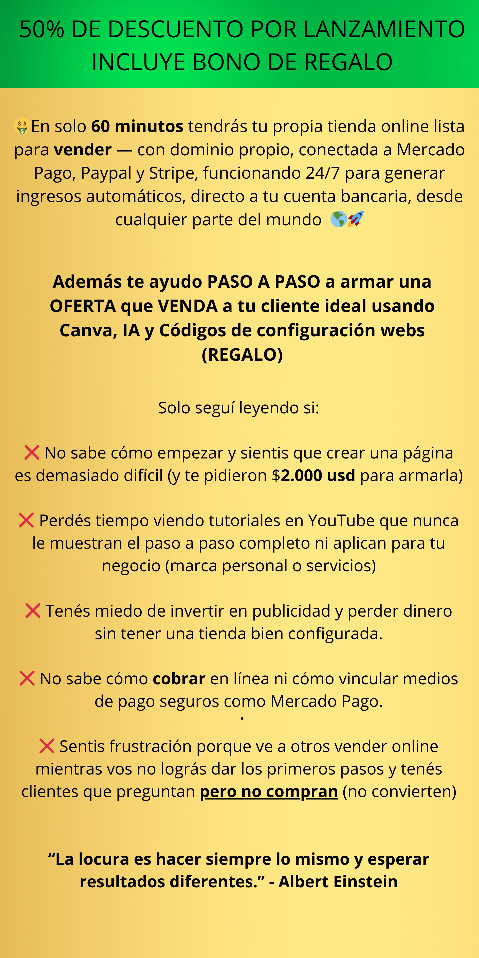 Usamos Shopify, que es la que mejores resultados me dio, como landing, configuración de pagos, informes y seguimiento, es moderna (cotiza en bolsa) y fácil de manejar, sin necesidad de programar. Además, te enseño a configurarla para cobrar con Mercado Pago, PayPal o transferencia.